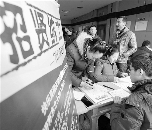 1月20日,求职者在安徽省淮北市迎春大型人才交流会上报名。当日,“2016年淮北市迎春大型人才交流会暨定期人才招聘会”举办,50多家企业提供了多个工种的1200余个工作岗位。