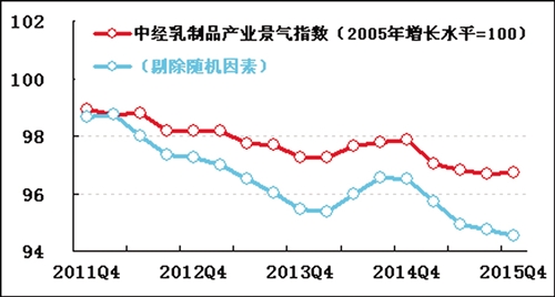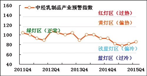 2015年四季度,中经乳制品产业景气指数为96.7,与上季度持平;中经乳制品产业预警指数为85.2,比上季度上升3.7点,回升至平稳的“绿灯区”。