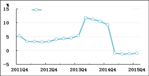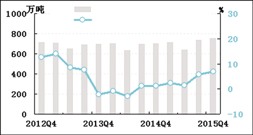 经初步季节调整,截至2015年四季度末,乳制品行业从业人数为28.1万人,同比增长4.3%,增速比上季度下降0.4个百分点,用工需求增长继续放缓。作为与消费关联密切的行业,在整体工业用工减少的背景下,该行业仍保持用工增长,一定程度上体现了行业的景气扩张态势。