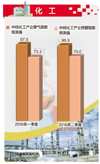 统计模型测算结果显示,2016年一季度和2016年二季度中经化工产业景气指数分别为97.0、96.9,预警指数分别为73.3、70.0,均有所放缓。