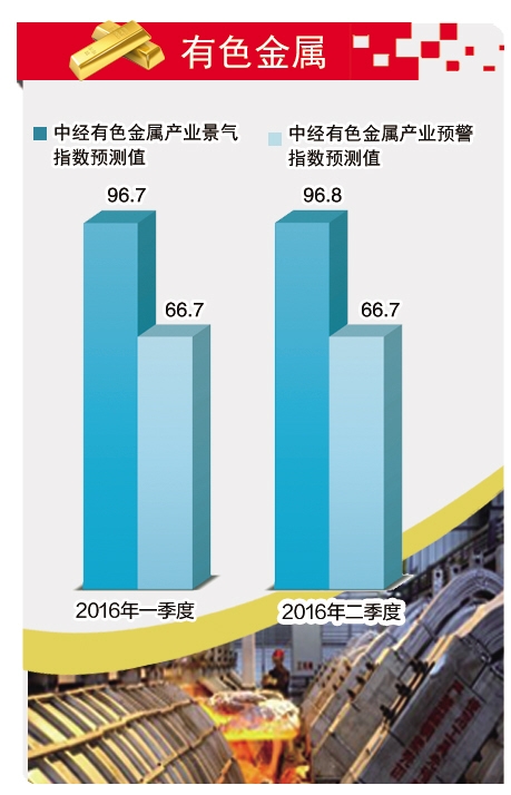 展望2016年一季度,有色金属价格回升或依旧乏力。但也应看到,当前我国经济长期向好的基本面没有改变。在未能充分考虑政策效应的情况下,经模型测算,2016年一季度与二季度中经有色金属产业景气指数为96.7、96.8,预警指数分别为66.7、66.7。