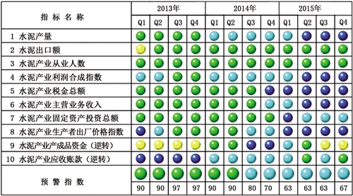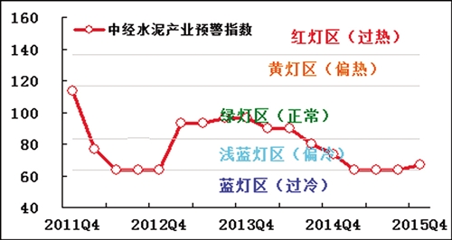 2015年四季度,中经水泥产业景气指数为97.4,比上季度下降0.2点;中经水泥产业预警指数为66.7,比上季度上升3.3点,继续运行在“浅蓝灯区”下临界线附近。
