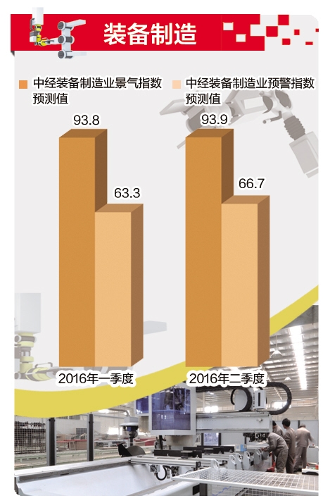 经模型测算,预计2016年一季度和2016年二季度中经装备制造业景气指数分别为93.8和93.9,中经装备制造业预警指数分别为63.3和66.7。