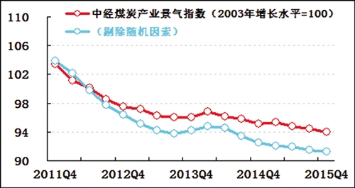 2015年四季度,中经煤炭产业景气指数为93.9,比上季度下降0.5点;中经煤炭产业预警指数为55.6,比上季度下降3.7点,继续在过冷的“蓝灯区”运行。