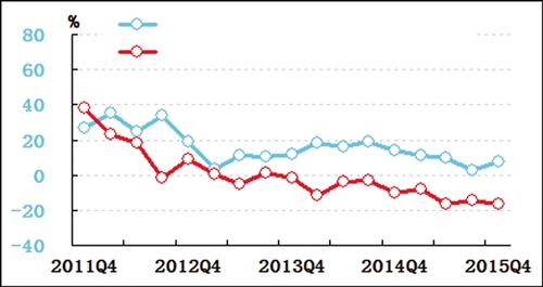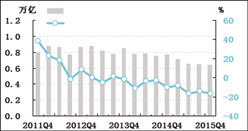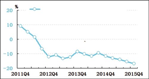 四季度,煤炭产业生产者出厂价格同比下跌16.8%,跌幅比上季度扩大1.2个百分点,已连续14个季度下跌,且最近5个季度呈现跌幅扩大走势。当前,国内煤炭市场供需矛盾突出,价格持续下跌,其原因主要是受国内经济增长放缓、清洁能源发展提速以及节能减排力度加大等因素的影响。截至2015年12月23日,环渤海5500大卡动力煤价格为372元/吨,比年初下跌148元,跌幅为28.5%。