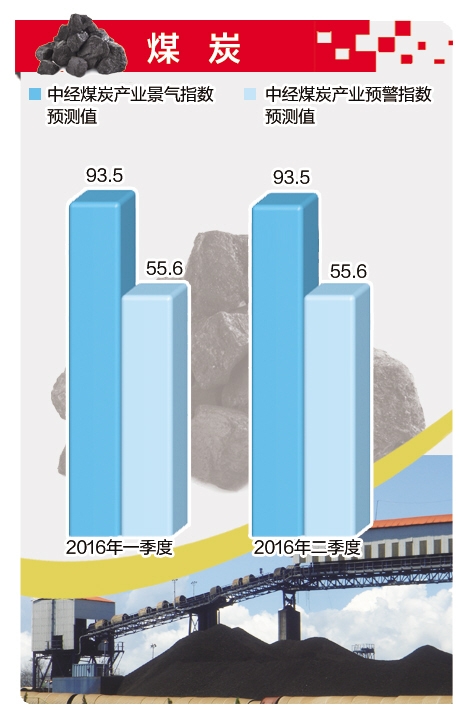 经模型测算,2016年一季度和二季度,中经煤炭产业景气指数均为93.5,总体延续下降态势;预警指数均为55.6。