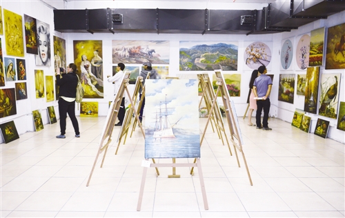 日前,中国驻南非大使馆携手南非约翰内斯堡市文化局等机构在约翰内斯堡市新东方商城举行“欢乐春节走进商城——中国装饰油画展”活动。图为南非民众参观展览。 本报驻约翰内斯堡记者 蔡 淳摄