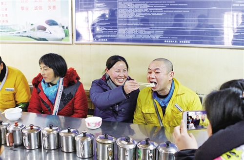 吃着妻子亲手包的饺子,上水员们的幸福跃然脸上。“提前的年夜饭”增进了铁路夫妻之间朴实的感情,让职工家属们对铁路工作加深了了解,更是给“奋战春运、服务一线”职工的最好礼物。