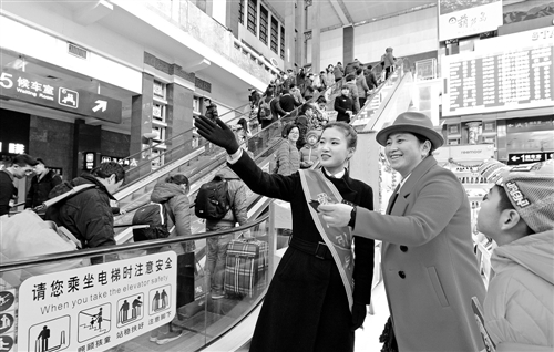 2月5日,北京站迎来客流高峰,超过17万人从这里踏上回家的路。对90后客运员董璇来说,自4年前成为铁路人,她就没有回家过次春节,刚刚订婚的今年也不例外。记者问她会不会想家,她说不会,因为“顾不上”。从晚上6:30到次日8:30,或是从早上8:30到晚上6:30,她一直“流动”在大厅与候车室,回应询问、指路,帮忙拎行李、抱孩子,几乎每分钟都有旅客前来求助。