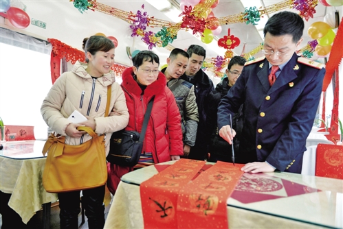 2月5日,在由贵阳开往烟台的K1202次列车上,成都铁路局贵阳客运段职工黄绍基现场为旅客书写春联。