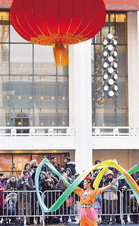 2月9日,一名舞蹈艺人在美国纽约林肯中心广场为市民表演彩带舞。当天,纽约林肯中心为庆祝中国传统农历新年的到来,举行广场免费公众演出,全美舞蹈协会和纽约华人舞蹈团表演富有中国传统特色的节目。 新华社记者 王 雷摄