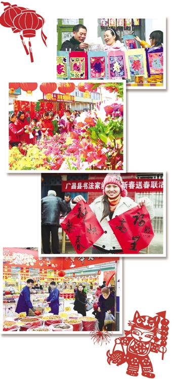 图①2月4日,山东郯城县马头镇,市民在选购传统装饰品“挂门笺”,为节日增添气氛。 房德华摄