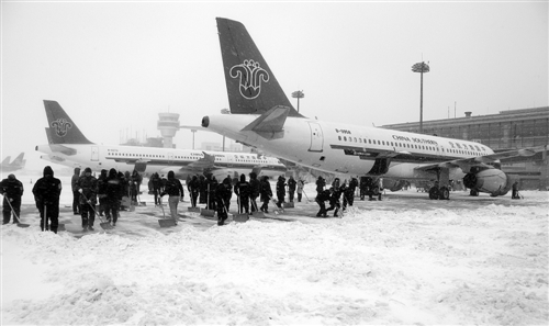 2月12日夜间至13日,大连市接连降下冻雨和大雪,市内机场、高速和铁路运输受阻,为及时除雪保障交通顺畅,大连市号召社会各界各单位及时启动除雪工作。图为2月13日,南航大连分公司员工启动除雪作业。 王有勉摄