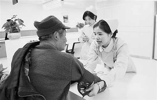 日前,全国首个互联网医疗区域手术中心“微医集团(杭州)手术中心”在浙江杭州正式投入使用。患者可“点名医”来家门口手术,并通过微医集团的“大数据平台”进行后期的复诊等环节。图为在微医集团杭州手术中心,医护人员为患者测量血压。 新华社发