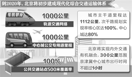 北京市交通委委员容军介绍,2020年,北京将拥有公共交通快速通勤系统,形成1000公里的轨道交通网络,中心城公交专用道里程达1000公里,公共交通站点500米覆盖率达到100%。道路网功能不断完善,承载能力大幅度提升,城市快速路总里程达461公里,城市主干道里程达1112公里,次干路规划实现率核心区达100%,中心城达80%。打造地铁、市郊铁路、地面公交、小汽车组成的“1小时城市交通圈”,形成高品质的大都市区交通体系。打造安全、便捷、舒适、宜人的步行和自行车出行环境,形成“1刻钟生活圈”。