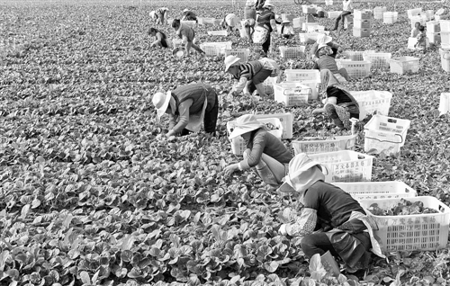 ⇧ 云南砚山县稼依镇引进农业综合开发公司,建成种植基地5000亩,加快了农村土地流转步伐,实现了公司盈利、农民增收、产业增效“三丰收”。图为稼依镇的农民在蔬菜种植基地收菜。 新华社记者 杨宗友摄