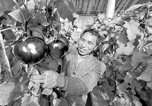 ⇦ 日前,河北乐亭县新寨镇杀马店村农民在蔬菜大棚中采摘茄子。乐亭县大力发展现代农业,全县共发展设施蔬菜12万亩,总收入达到14亿元以上。 刘江涛摄