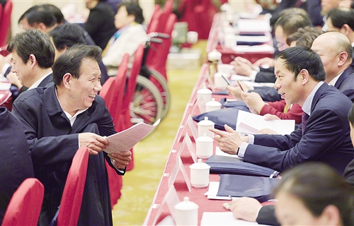 3月13日,人大河北代表团在驻地举行全体会议,审议“两高”报告。石克荣代表(左一)和同团代表讨论报告内容。 本报记者 李景录摄