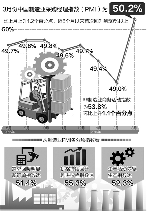 数据显示,3月份,制造业PMI为50.2%,比上月上升1.2个百分点,重回扩张区间;非制造业商务活动指数为53.8%,比上月上升1.1个百分点,非制造业扩张步伐有所加快。
