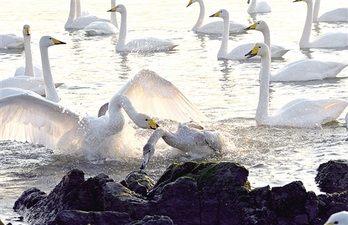 “你看天鹅一点也不怕人,这和它们刚来时可不一样。”荣成市大天鹅国家级自然保护区管理处的科研科科长于壮志说,大天鹅初到荣成,保持高度警觉的天性,百米外有人稍一靠近就会惊起。如今,人鸟之间都能“零距离”接触了。