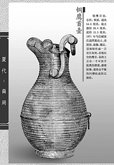 随着社会的不断发展,铜壶也形成了各个时期不同的风格和特征。一般认为,商代和西周时期的壶,庄重浑厚,纹饰华丽。到了春秋战国,则变为制作轻巧,纹饰简朴。鹰首壶则巧妙地将两者聚为一身,既继承了商代、西周的传统,又表现出了春秋战国的特征,取长补短,相得益彰。它的设计构思有着独到的过人之处,将壶顶作成仰视的鹰首,利用鹰嘴的自然形态作为壶的流口,形象逼真,自然流畅。当人们提着横梁倾斜壶身倒酒时,鹰嘴的上唇便可自动打开。倒完酒后将壶直立,鹰嘴又会自动合闭。整个壶盖用铜环与提梁相联,既能自由开启,又可避免脱落。这独具匠心的设计,科学地将艺术观赏与实用功能,自然形态与人工制作有机结合在一起,惟妙惟肖,天衣无缝。在表现形式上,运用浮雕技法,使鹰首的双眼高凸于壶顶之上,格外引人注目。这大胆夸张的表现手法,更加突出了鹰眼那敏锐犀利的本能特征。鹰嘴则采用圆雕技法,比例和谐,结构严谨,线条丰满,形态逼真,大大增强了造型的立体感和艺术感染力。整个鹰首制作规整,雄健有力。较多地保留了前代铜器中的严肃庄重、凝练浑厚的遗风。而壶身则器壁轻薄,纹饰简练,表现出战国时代的明显特征。设计者采用了由平横的凹槽组成的瓦棱纹,装饰壶身,利用横线条能使人产生稳重感的视觉效果,使壶身在轻巧中显现出稳重,简朴中透露着华丽。与鹰首相辅相映,浑然一体。