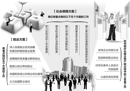 答:化解过剩产能是今年供给侧结构性改革的首要任务,妥善安置职工则是其中的关键举措。我们总的考虑是企业主体、地方组织、依法依规,通过多种渠道和方式,规范有序地做好职工安置工作。一是支持企业内部分流。鼓励企业开辟新的就业岗位,内部分流安置一批富余人员。同时通过加大援企稳岗补贴、鼓励企业吸纳补贴等政策落实,支持有能力的企业更多选择内部安置。二是促进转岗就业创业。启动实施再就业帮扶行动。普遍开展转岗培训或技能提升培训,落实职业培训补贴,增强失业人员就业能力和职业转换能力。免费提供就业指导、职业介绍、政策咨询等服务。加大创业培训、创业指导、政策扶持和跟踪服务力度。三是对符合条件人员实行内部退养。对距法定退休年龄五年以内、再就业有困难的职工,职工本人自愿,企业同意,可实行内部退养。企业主体消亡的也可以由政府托管。四是公益性岗位兜底。对就业困难人员建档立卡,提供“一对一”就业援助。对确实难以再就业的大龄困难人员和零就业家庭人员,通过公益性岗位托底帮扶。我们将扎实稳妥做好职工安置工作,全力以赴兜住民生底线,为顺利化解过剩产能和推进供给侧结构性改革创造有利条件。