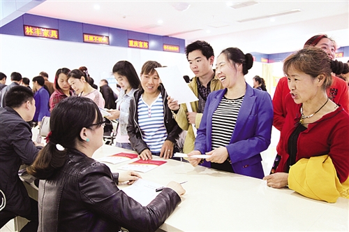 4月15日,重庆市梁平县返乡农民工在企业招聘摊位前了解用工需求。当日,该县举办返乡民工就业暨县工业园区企业用工专场招聘会。据了解,近几年,梁平工业园区发展迅猛,企业入驻速度加快,需要大量产业工人。为了吸引返乡农民工,许多企业除了缴纳工伤保险、养老保险、医疗保险等社会保险外,还提供免费食宿,设立全勤奖、优秀员工奖等奖励项目。刘 辉摄