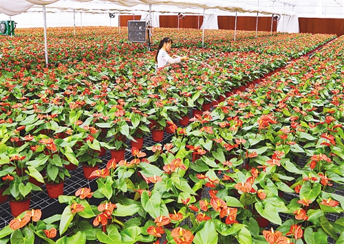 时下,江西会昌县麻州镇千亩现代农业综合示范园,花农正对智能温棚里的10万多盆红掌进行浇水养护。国家统计局最新数据显示,一季度我国第一产业增加值8803亿元,同比增长2.9%。 朱海鹏摄
