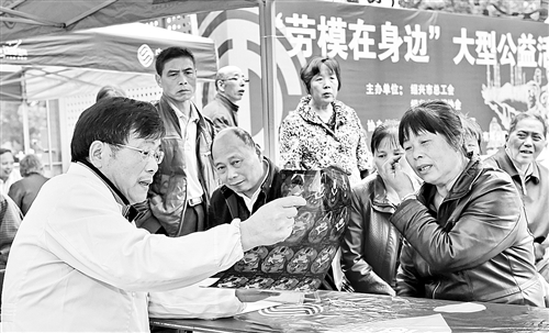 4月27日,绍兴市劳模、中医余水园(左一)在为群众义诊。当日,浙江绍兴市的48位全国、省市劳模在市区汇金广场及各县市区举办“劳模在身边”大型公益活动。这些来自医疗、法律、教育、燃气等行业有专门技能的劳模,以为民服务的形式展示劳模风采,迎接“五一”国际劳动节的到来。
