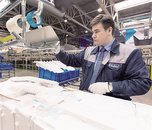 中国家电品牌海尔在俄罗斯鞑靼斯坦共和国卡马河畔切尔尼的冰箱制造基地日前正式投产运营。目前该工厂拥有员工248名,建设方面投入的资金已达3910.88万美元。预计截至2017年,卡马河畔切尔尼海尔工厂将有500名员工,其外包业务将创造超过1200个工作岗位。工厂第一阶段产能为25万台,第二阶段50万台,将销往俄罗斯和独联体国家以及部分欧洲市场。图为工人进行内胆预装。