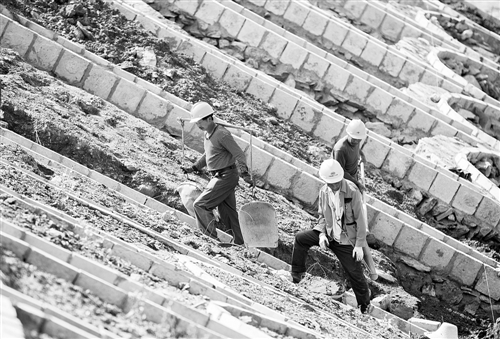 5月1日,中国铁建二十五局建设工人在九景衢铁路都昌站护坡施工。节日期间,许多劳动者坚守在九景衢铁路建设一线。