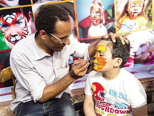 5月2日,在埃及吉萨动物园里,一名小男孩涂“花脸”庆祝“闻风节”。当日,埃及迎来传统节日“闻风节”,民众纷纷来到公园、绿地,感受春日气息。 新华社发