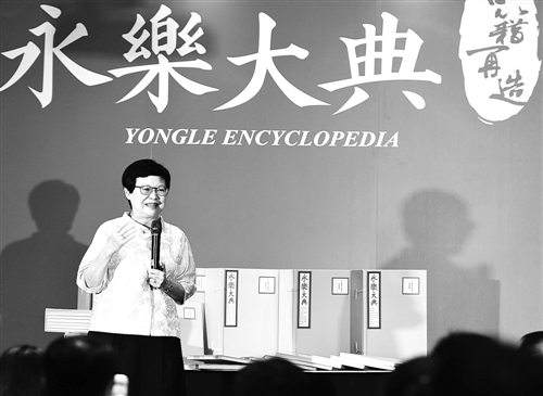 5月4日,台北故宫博物院典藏的62册《永乐大典》首度出版发行高仿真古籍本。该出版工程历时3年,以高规格的古籍再造方式,再现这部旷世奇书的历史原貌。目前,该书限量发行520套,在台北存了180套,其余已运往大陆,多数将销往大陆的图书馆和博物馆。图为台北故宫博物院院长冯明珠在介绍《永乐大典》出版印制的过程。