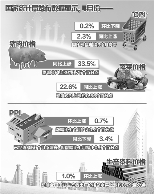 4月份,CPI同比上涨2.3%,这也是CPI同比涨幅连续3个月持平。国家统计局城市司高级统计师余秋梅分析说,尽管CPI同比涨幅与上月相同,但猪肉和蔬菜价格同比涨幅依然较高。
