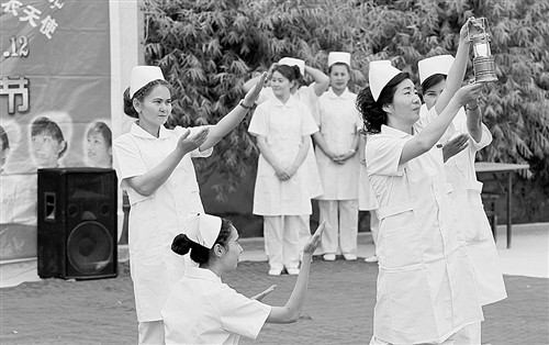 5月12日,新疆库车县塔里木乡卫生院举行庆祝“国际护士节”系列活动,护士手捧象征南丁格尔精神的碗烛,喜迎第105个“国际护士节”。白 衣摄
