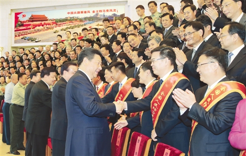 上午9时30分,习近平等来到京西宾馆会议楼前厅,同代表们亲切握手,并合影留念。