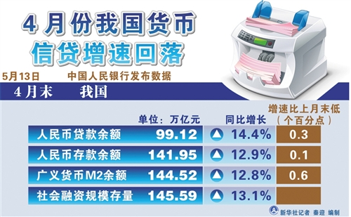 中国人民银行5月13日公布的数据显示,4月份新增贷款和社会融资增量、广义货币(M2)增速均出现回落,其中,M2为9个月以来首次跌破13%。分析人士认为,4月份金融数据回落是全球经济复苏迹象尚不显著、国内经济下行压力尚存等内外双重因素叠加的结果。但需要强调的是,仅靠单月数据还不足以得出趋势性的结论。