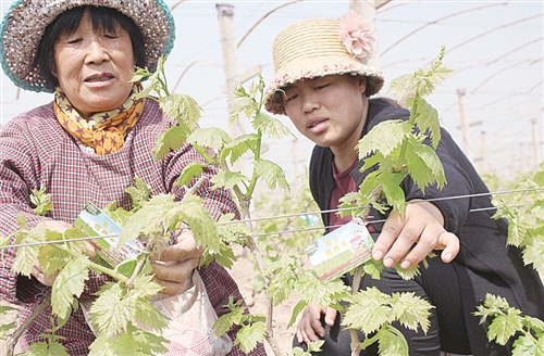 山东聊城市东昌府区拿出专项扶贫资金购买云朵庄园的葡萄树,将葡萄树所有权划归区内3个省定贫困村36家贫困户,产出的葡萄按市场价格回收,贫困户年均收益达4000元以上。图为云朵庄园人员在管理领养葡萄树。 本报记者 王金虎 通讯员 孟庆剑摄影报道