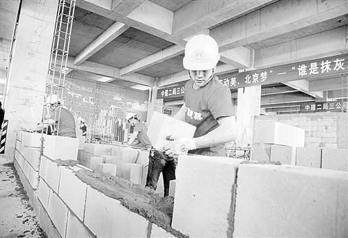 为加强施工技能人才队伍建设,中建二局三公司日前组织开展了“工匠情·劳动美”劳动技能竞赛,多名各工种的专业工人参加,获胜的技术工人获得“最美工匠”的称号。图为参赛者正在比赛现场砌筑。