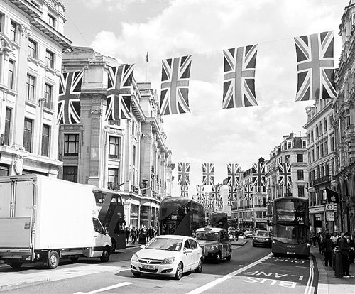 为迎接6月份英国女王伊丽莎白二世90岁寿辰官方庆祝活动,伦敦摄政街上挂满了英国国旗。本报驻伦敦记者 蒋华栋摄