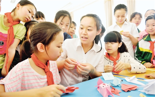| 5月31日,湖北兴山县高岚小学,来自朝天吼漂流景区的大学生志愿者正在和小学生们一起做手工,喜迎“六一”国际儿童节。据悉,为关爱大山中的留守儿童,兴山县开办了10个“希望家园”,招募志愿者247名,志愿者利用业余时间定期进山,对留守儿童提供帮扶。刘曙松摄 |
