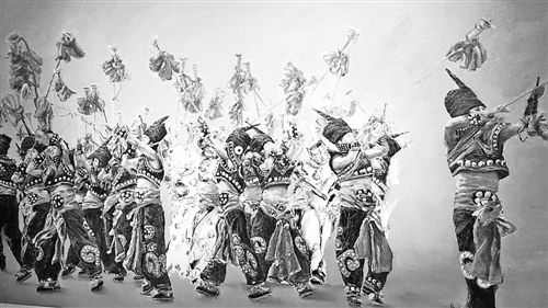 穿过成都画院极有纵深感的展厅,一组组画作指引我们走向历史悠远的长河:从古到今的马帮众人,带着沉甸甸的货物和肩上厚重的嘱托,走乡村,穿峡谷,过雪原,涉激流,以渺小的个体在艰苦卓绝的自然环境中激昂出了一首首生命的壮歌;而留在身后的,则是亲人远远送别的期盼,登高山之巅不舍的眺望,欲说还休颤抖的嘴唇;而沿途的风光亦是多姿多彩,会理的唢呐吹出了欢天喜地一片天,藏胞的舞蹈里是激情的生命和喜悦,而彝族老乡淳朴的面容正朝你微微含笑,作出了欢迎的手势……随着一幅幅画作的延展,马队的脚步一路向西,不断拓展开地理的广博,于是,我们见到了印度旖旎的风光、沙漠浩瀚的风情、清真寺高耸的屋顶,直至古罗马的雄伟与蔚蓝地中海永不停歇的波涛……跨越遥远的时空,中西方文化产生了最美的碰撞与共鸣。