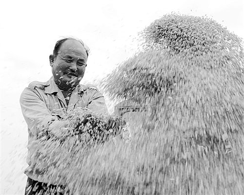 图为安徽省凤阳县小岗村村民正满脸欢喜地查看麦粒。日前小岗村4300亩高标准农田间,60多台收割机、运输车24小时开启,一刻不停抢收作业。收割下来的小麦,被直接送进烘干机,确保颗粒归仓。