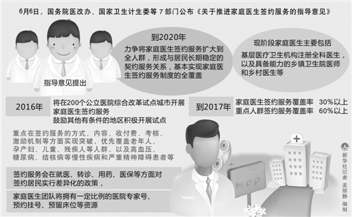 指导意见提出,2016年,将在200个公立医院综合改革试点城市开展家庭医生签约服务,鼓励其他有条件的地区积极开展试点。重点在签约服务的方式、内容、收付费、考核、激励机制等方面实现突破,优先覆盖老年人、孕产妇、儿童、残疾人等人群,以及高血压、糖尿病、结核病等慢性疾病和严重精神障碍患者等。到2017年,家庭医生签约服务覆盖率达到30%以上,重点人群签约服务覆盖率达到60%以上。