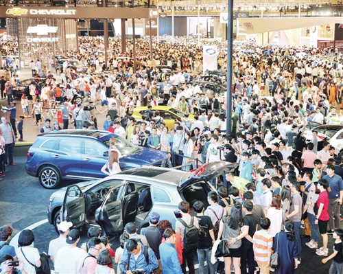 韩国2016釜山国际车展日前拉开帷幕,全球25个品牌的230余款车型在车展中亮相,吸引了韩国各地民众和国外观众到场观展,仅上周末观众人数就接近20万人次。图为热闹的车展现场。 本报驻首尔记者 杨 明摄