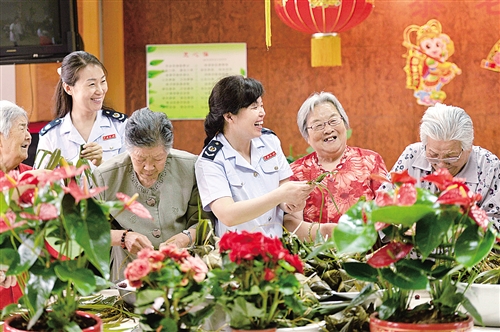 下图 端午节来临之际,河北保定市竞秀区国税局党员志愿者在当地敬老院和孤寡老人一起包粽子,共迎端午。