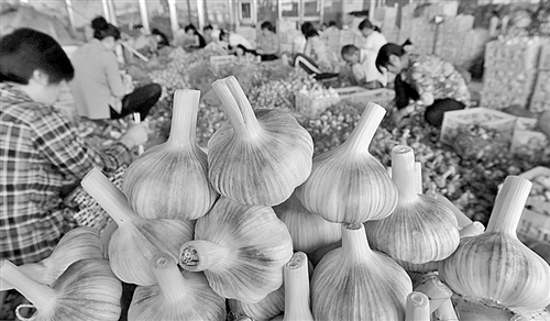 6月17日,在金乡大蒜国际交易中心,农民工给发往俄罗斯的新蒜剥皮。眼下正值大蒜之乡山东省金乡县大蒜交易旺季,吸引了周边地区众多农民工前来“淘金”,其收入每天可达100元至200元。 新华社记者 郭绪雷摄