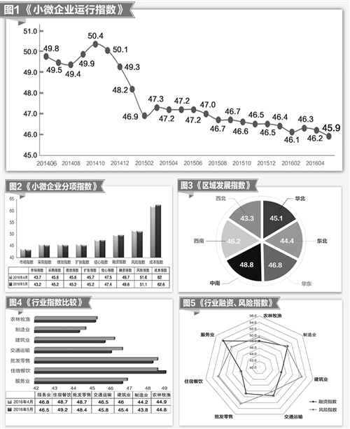 2016年5月份,“经济日报—中国邮政储蓄银行小微企业运行指数”(见图1)为45.9,较上月下降0.3个点,降幅较上月扩大0.2个点,表明本月小微企业市场运行情况依旧不容乐观。