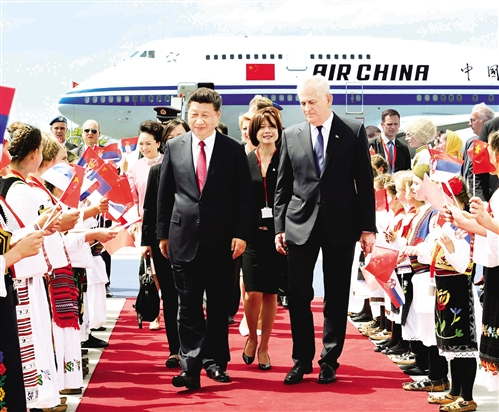 当习近平乘坐的专机进入塞尔维亚领空时,塞尔维亚空军战机升空护航。当地时间下午2时许,专机抵达贝尔格莱德尼古拉·特斯拉机场。习近平和夫人彭丽媛步出舱门,塞尔维亚总统尼科利奇夫妇、议长戈伊科维奇、总理武契奇、副总理兼外长达契奇等在机场迎接,并来到舷梯前同习近平和彭丽媛热情握手,热烈欢迎习近平和彭丽媛到访。少年儿童按照当地迎接贵宾的礼节献上鲜花、面包和盐,民众跳起欢快热情的传统舞蹈科罗舞。