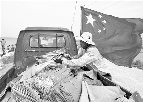 7月9日,抗洪人员在安徽省马鞍山市当涂县石臼湖大堤搬运防洪编织袋。当日,安徽省马鞍山市对沿江地区的大堤、圩埂和堤坝进行除险加固,以备战即将到来的台风“尼伯特”。 新华社记者 王 雷摄